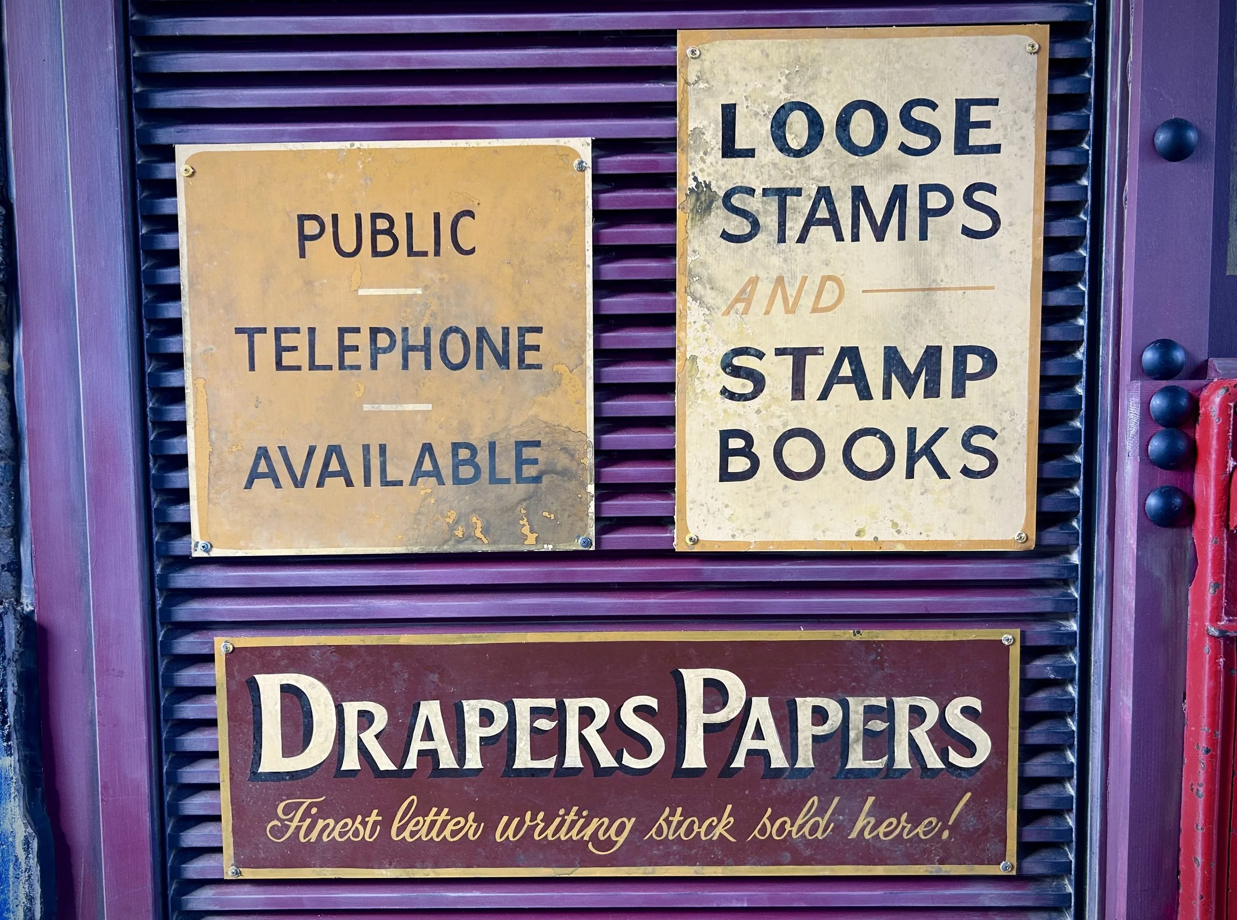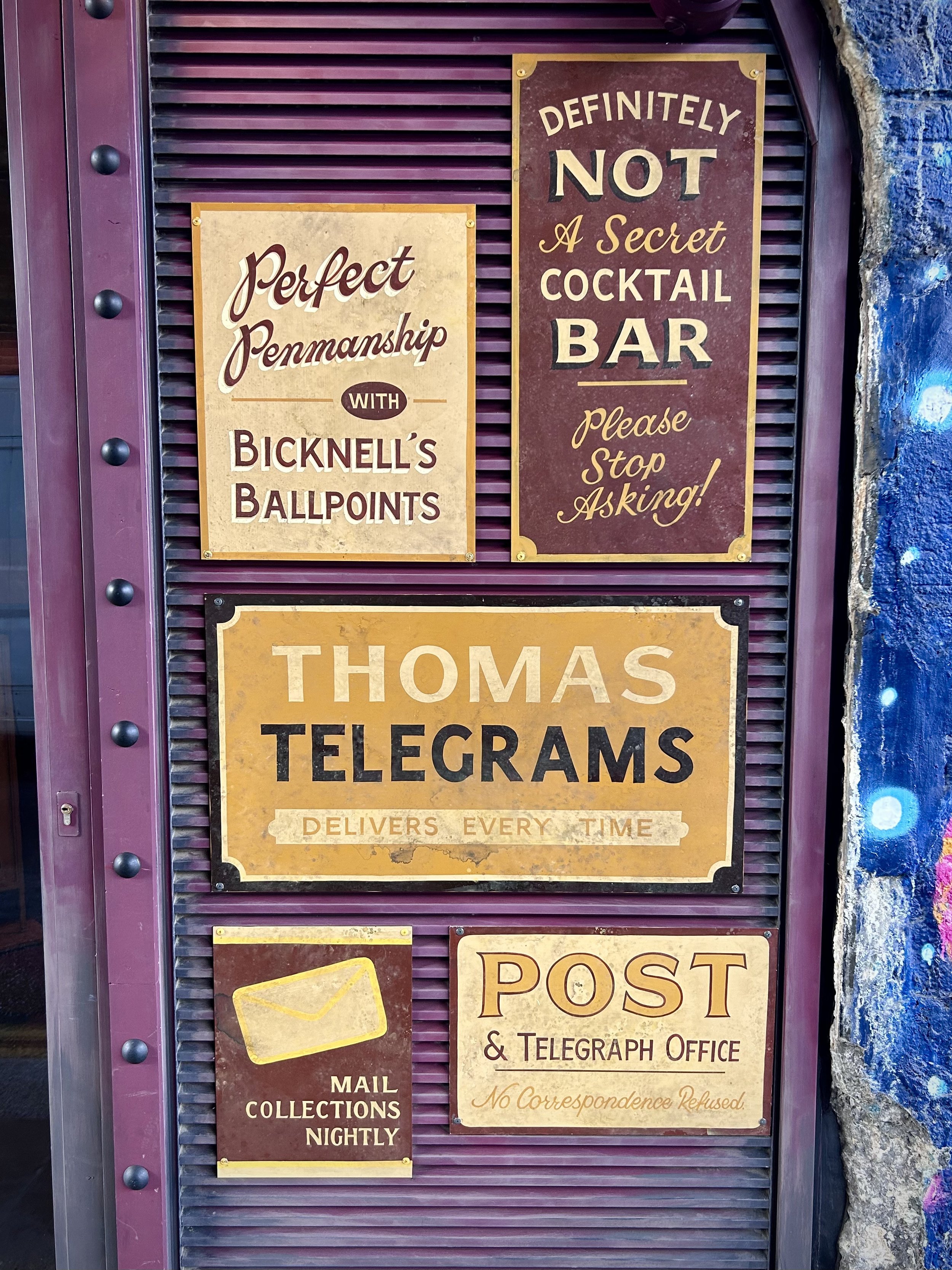 Hand Painted shopfront complete with faux-aged enamel signs, decorative painting around the venue, mural on brickwork, wayfinding and lots of little hand painted touches to make the venue appear more lived in.