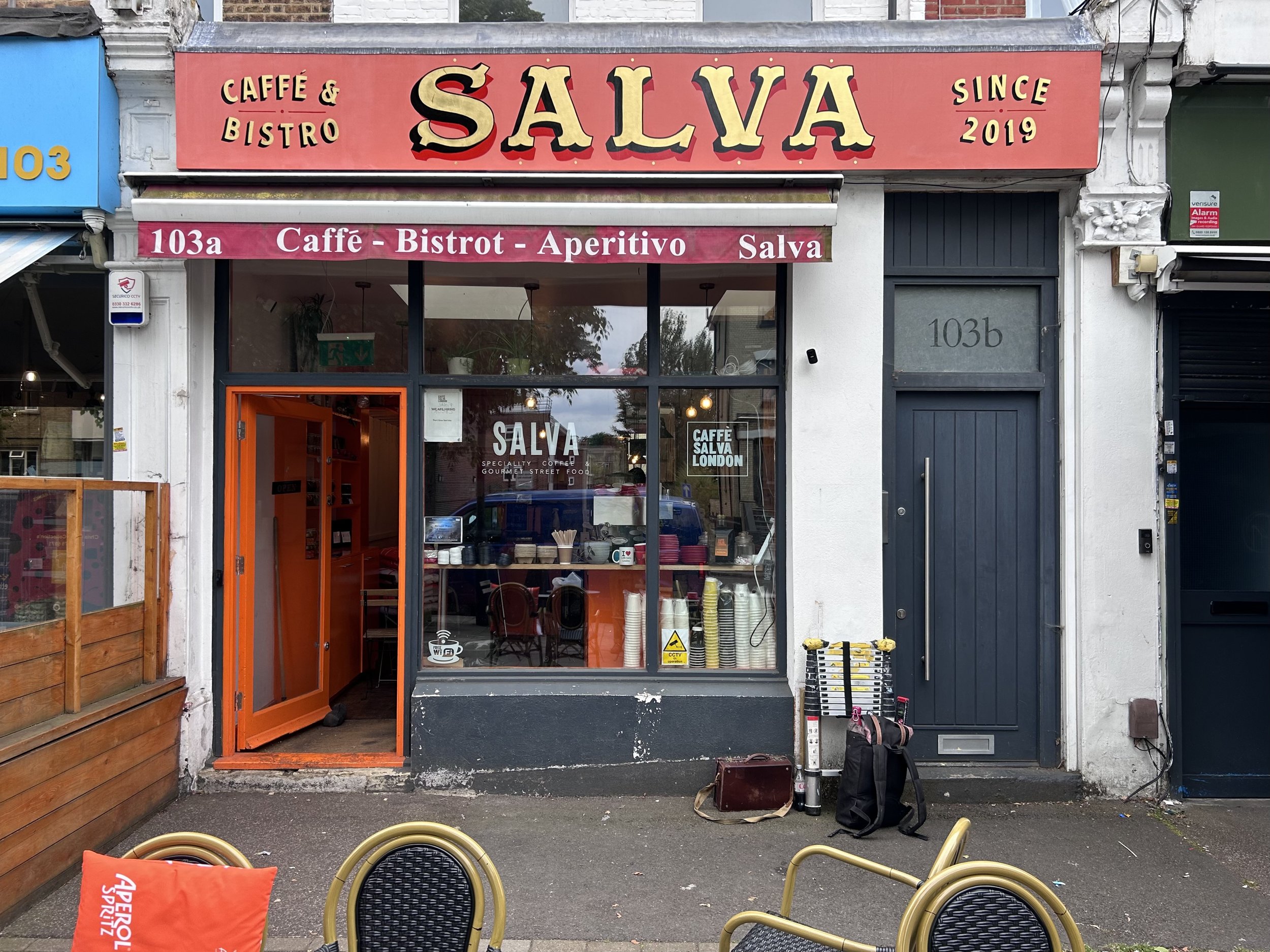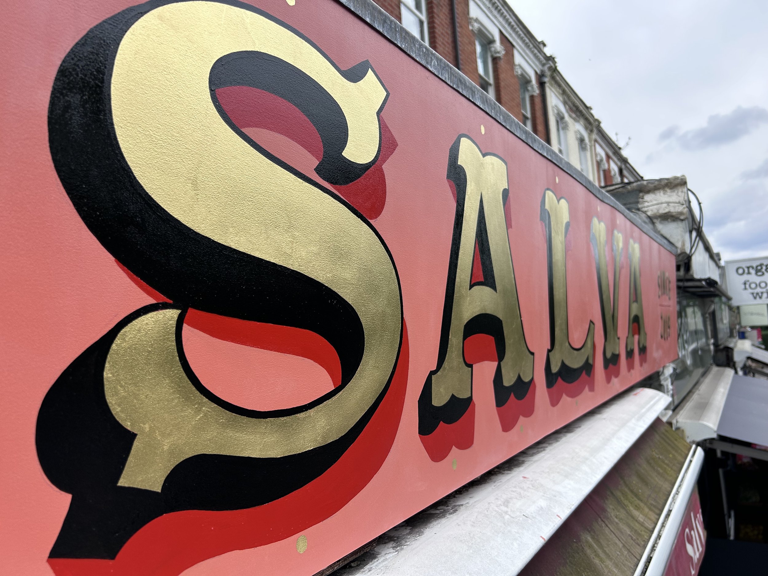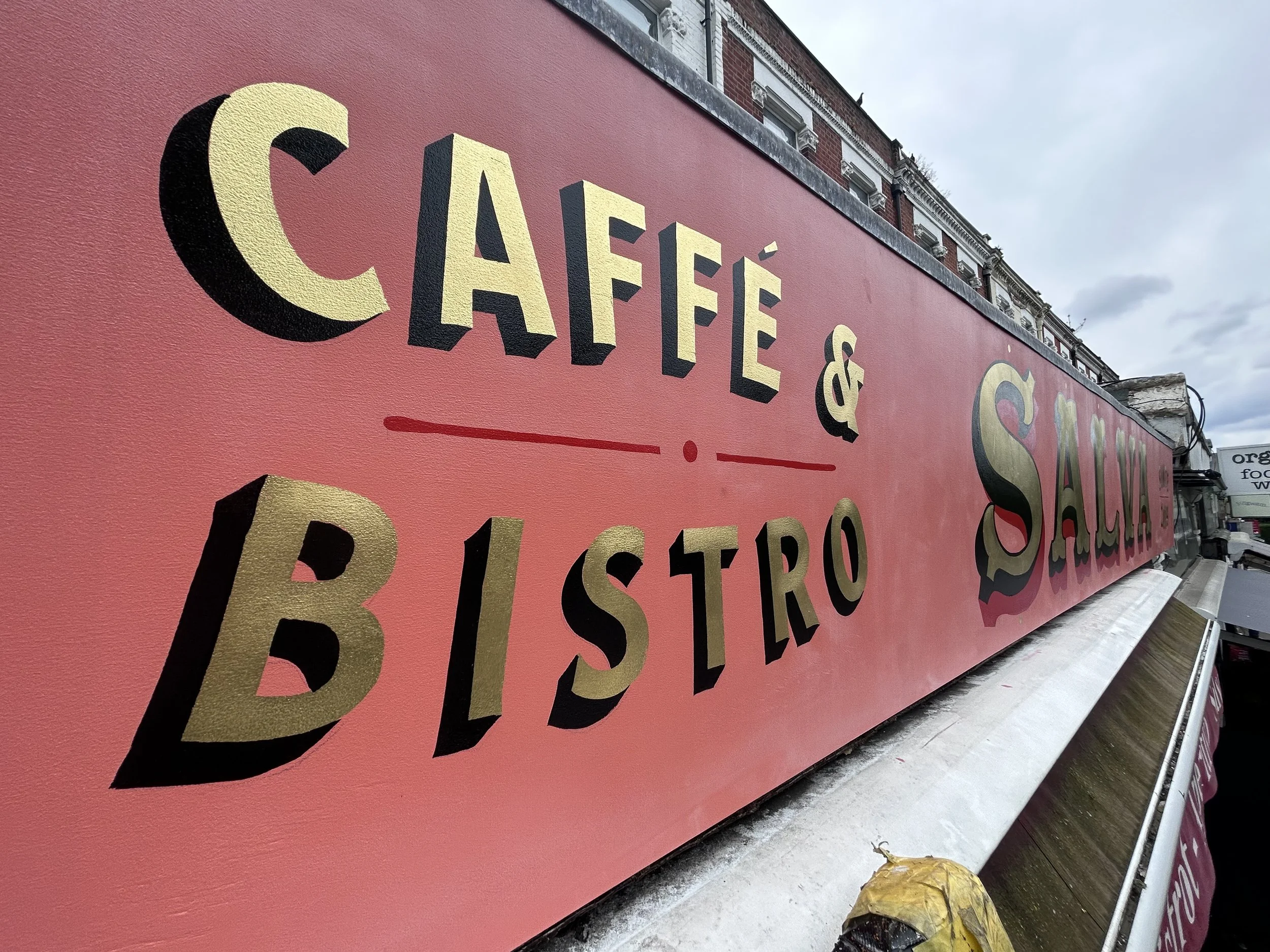 Shop Fascia designed and hand painted for a cafe in Dulwich. 23.5ct Gold Leaf and Enamels onto wooden panels.
