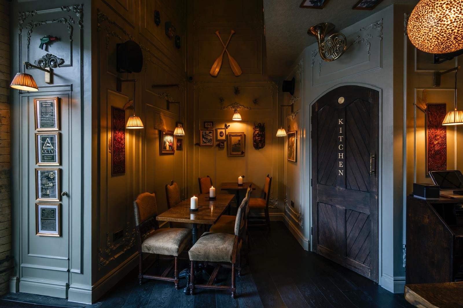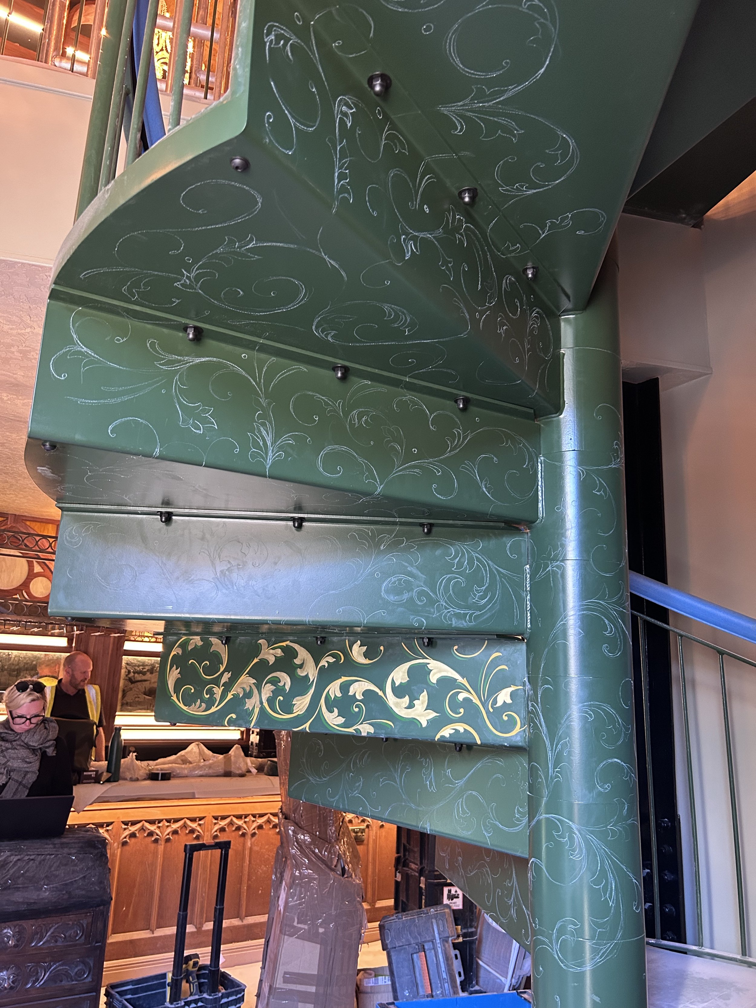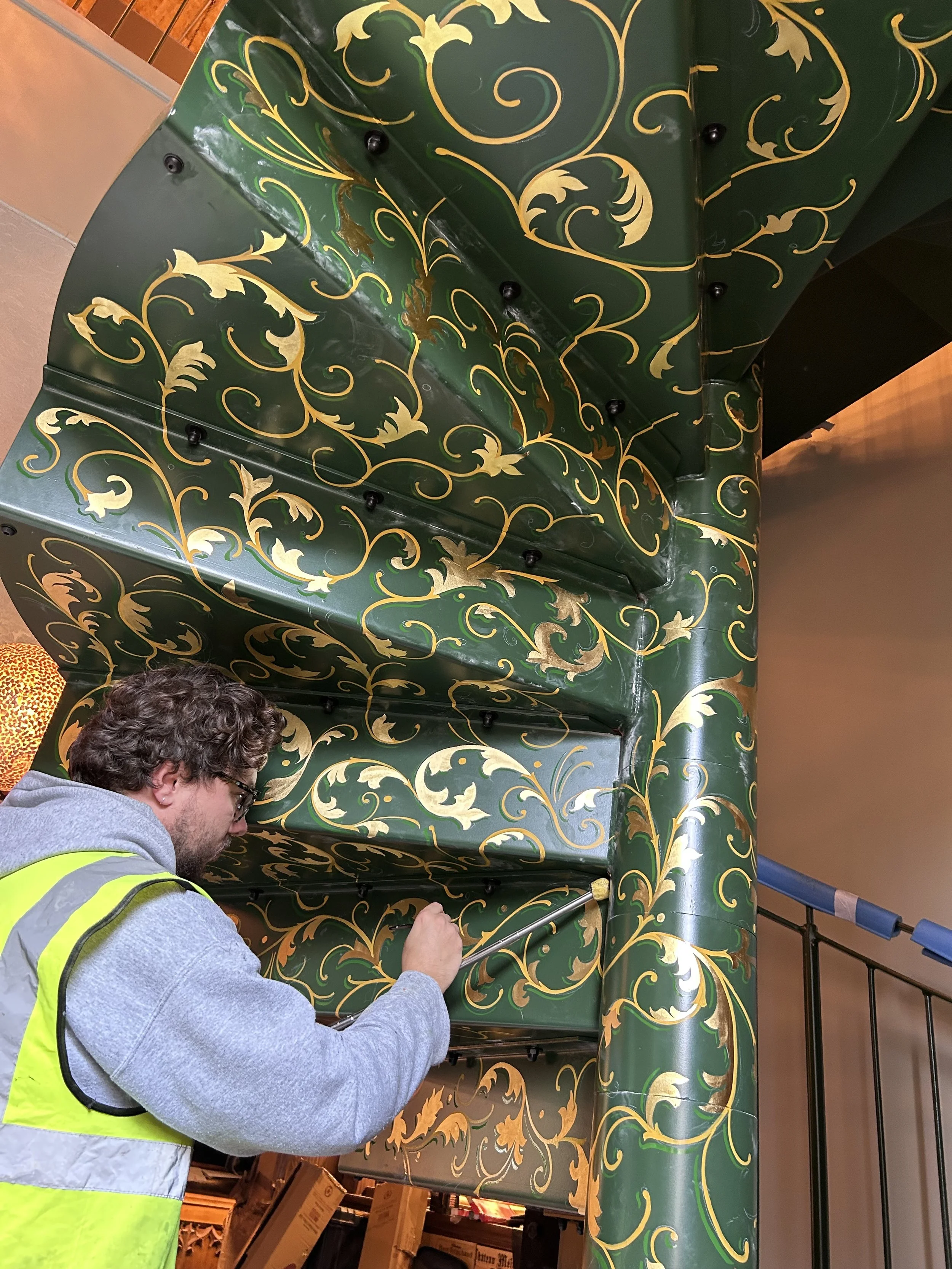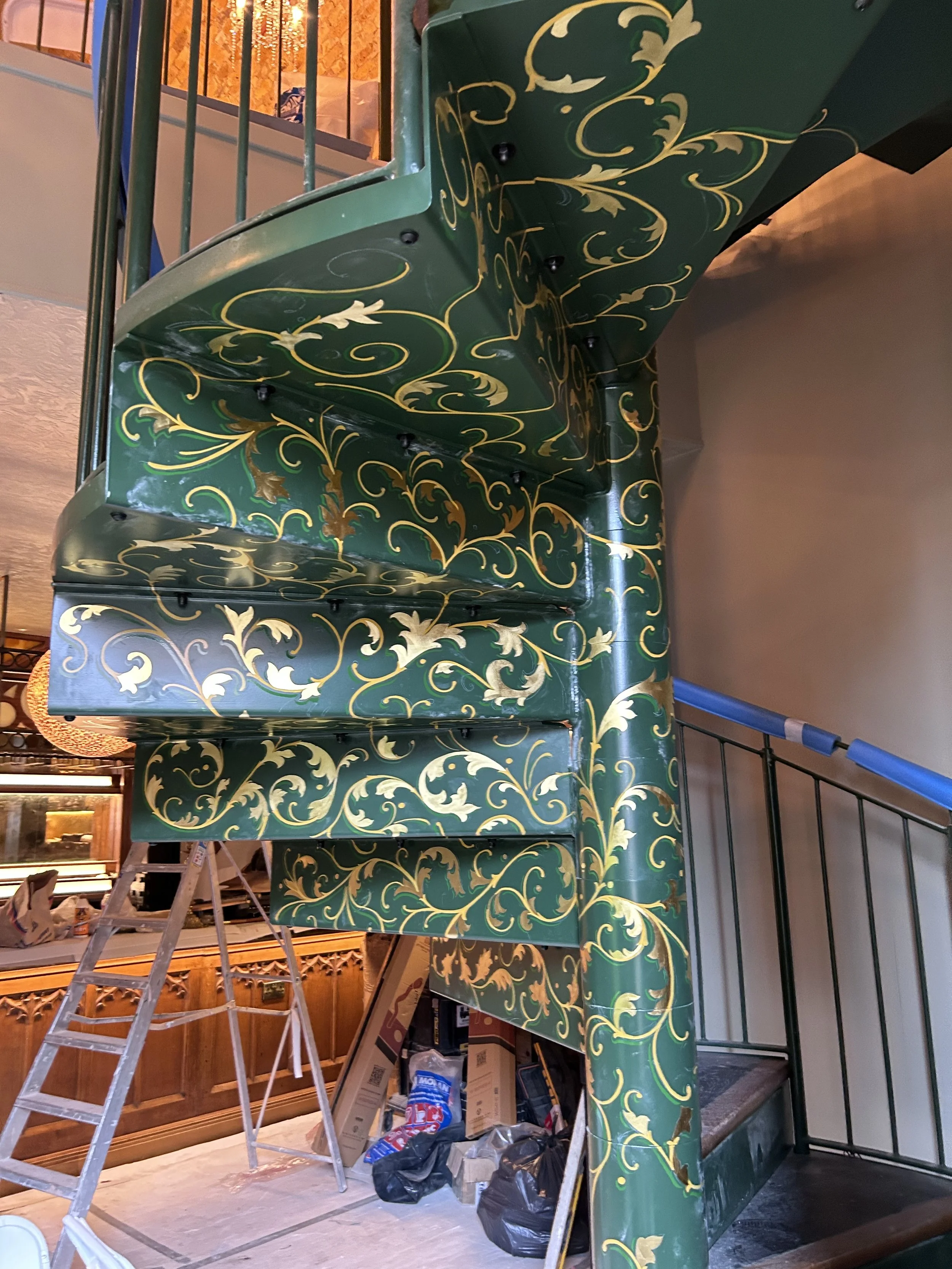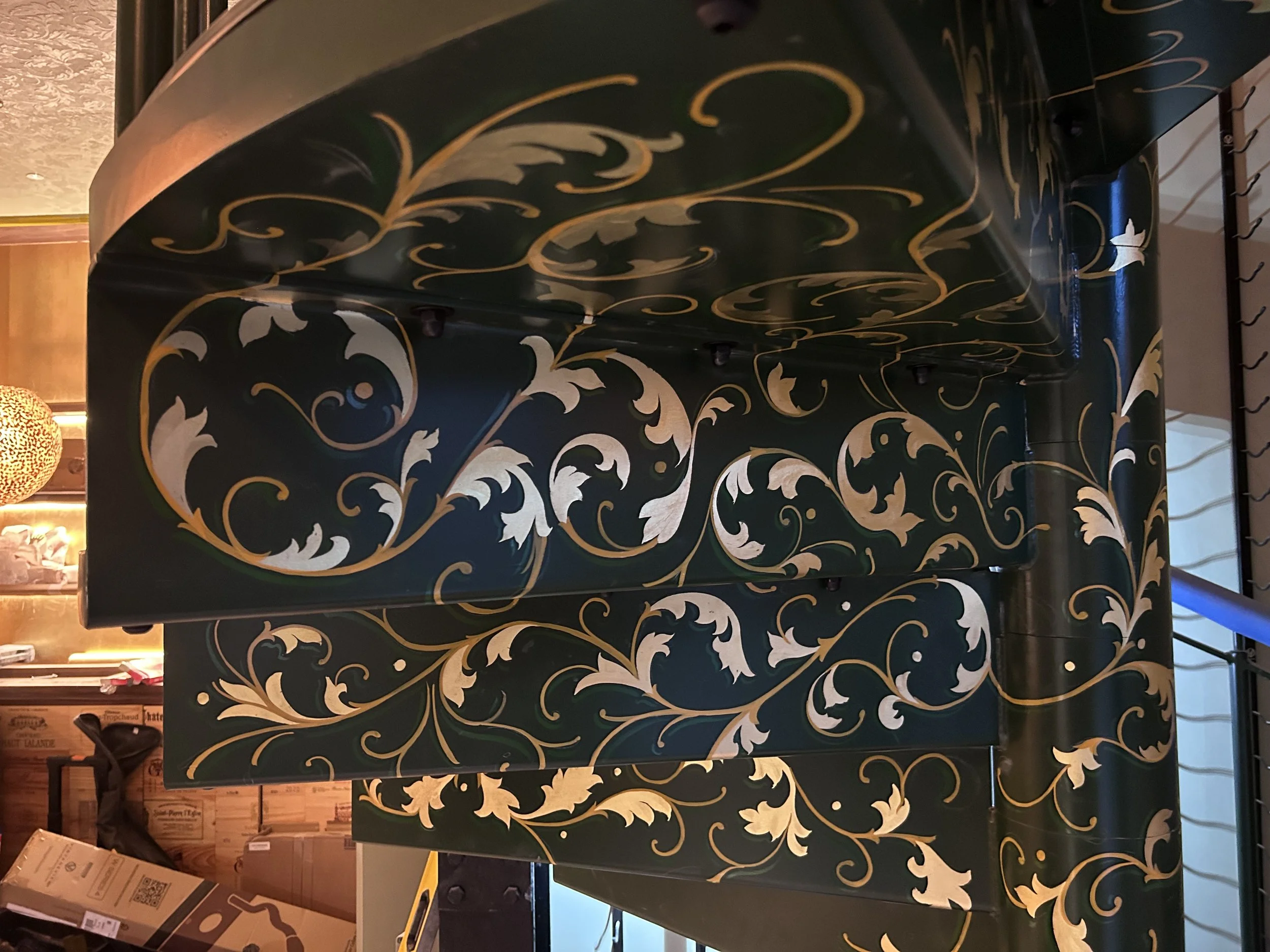 Decorative Acanthus leaves painted and Gilded with 23.5ct Gold leaf onto a staircase to echo designs of the wallpaper and architecture in this London Bridge cocktail bar. Internal wayfinding and sign on the entrance.