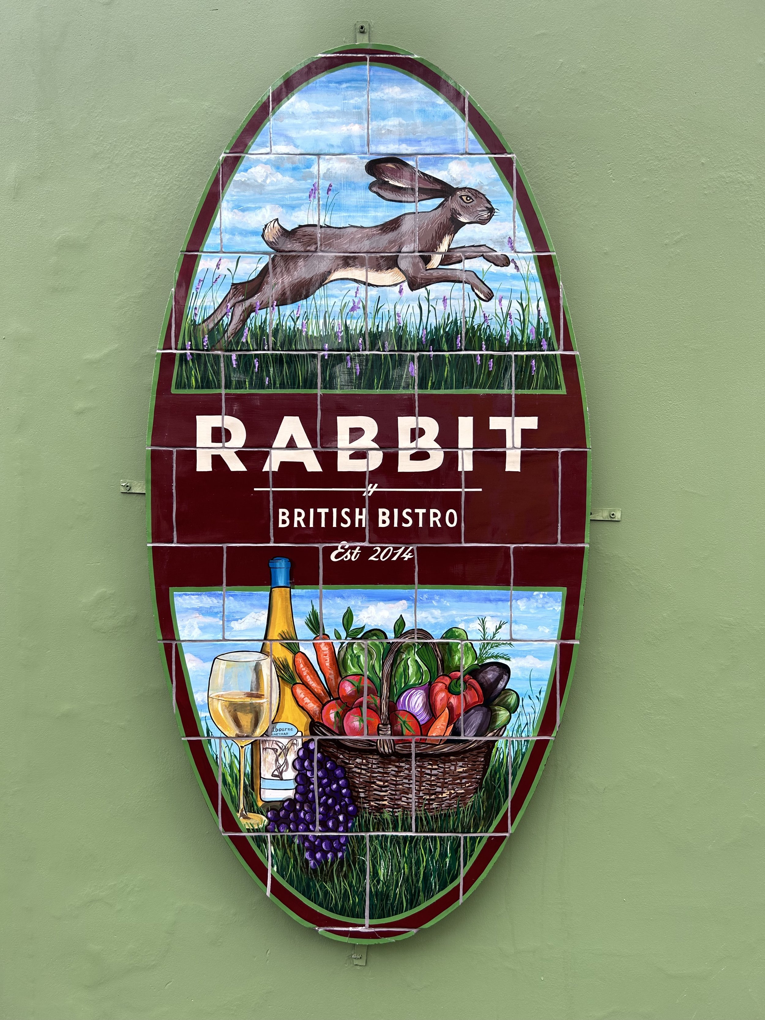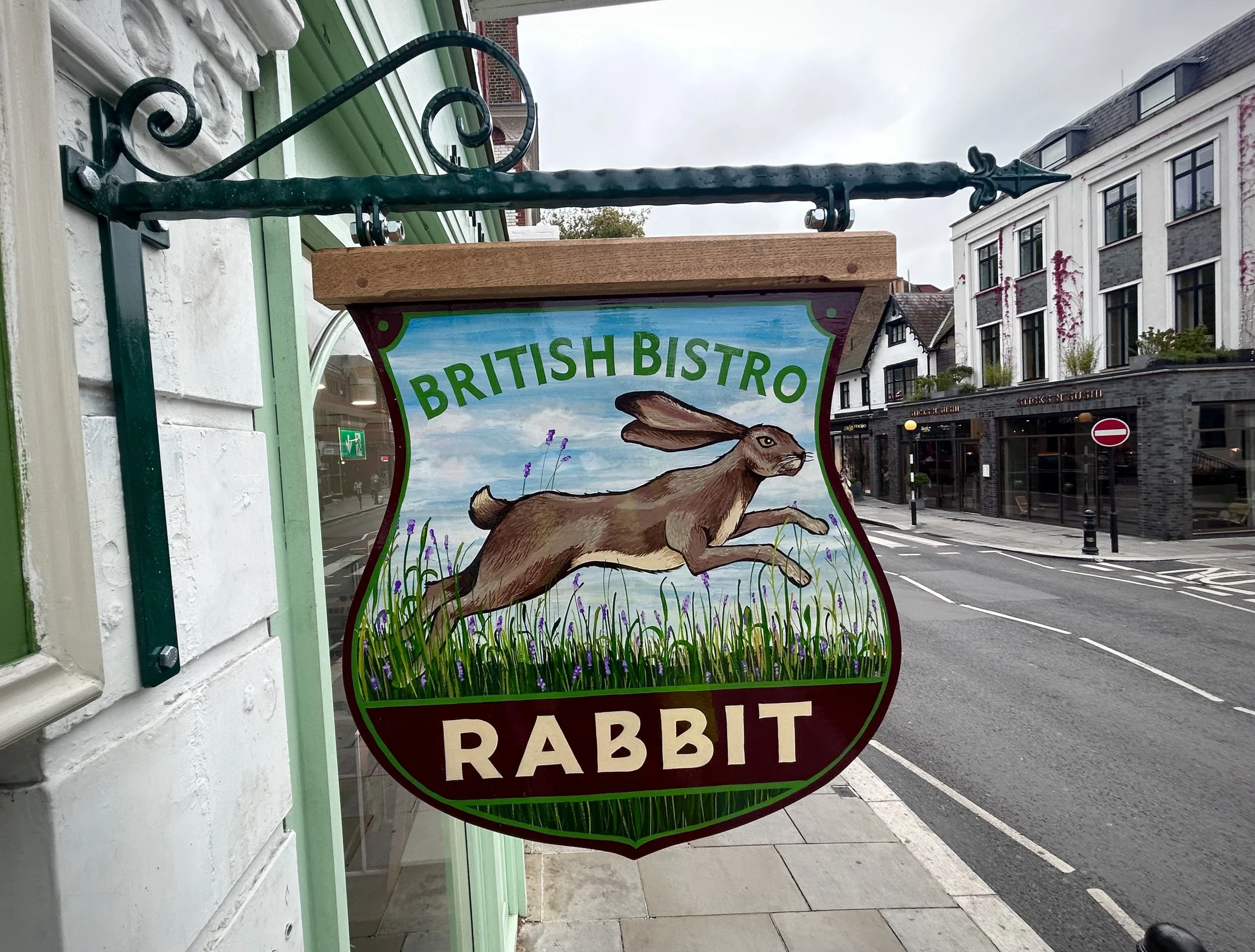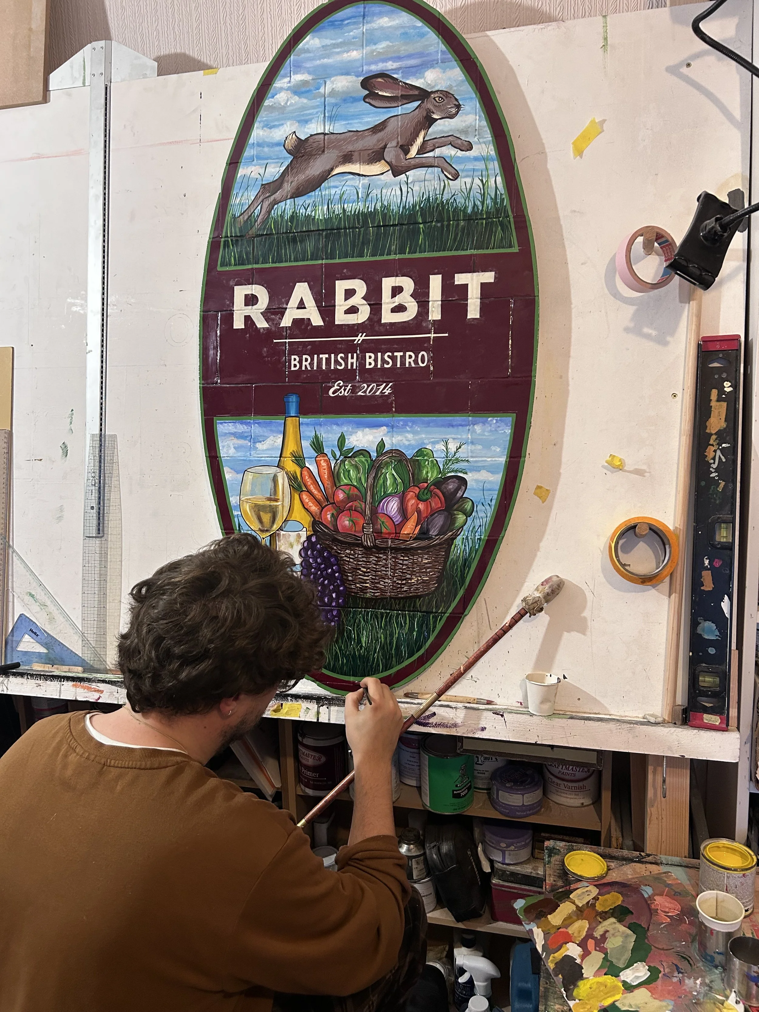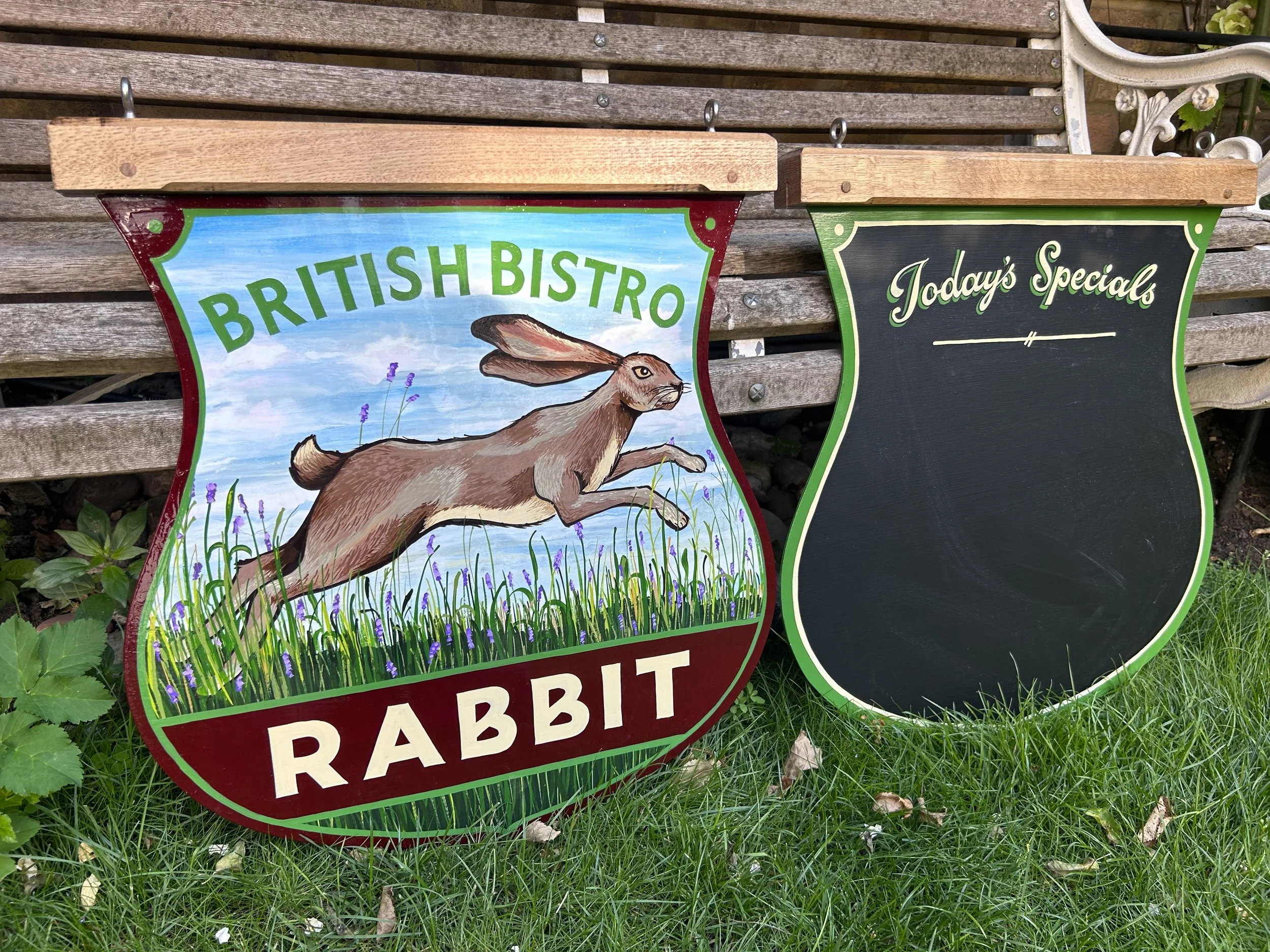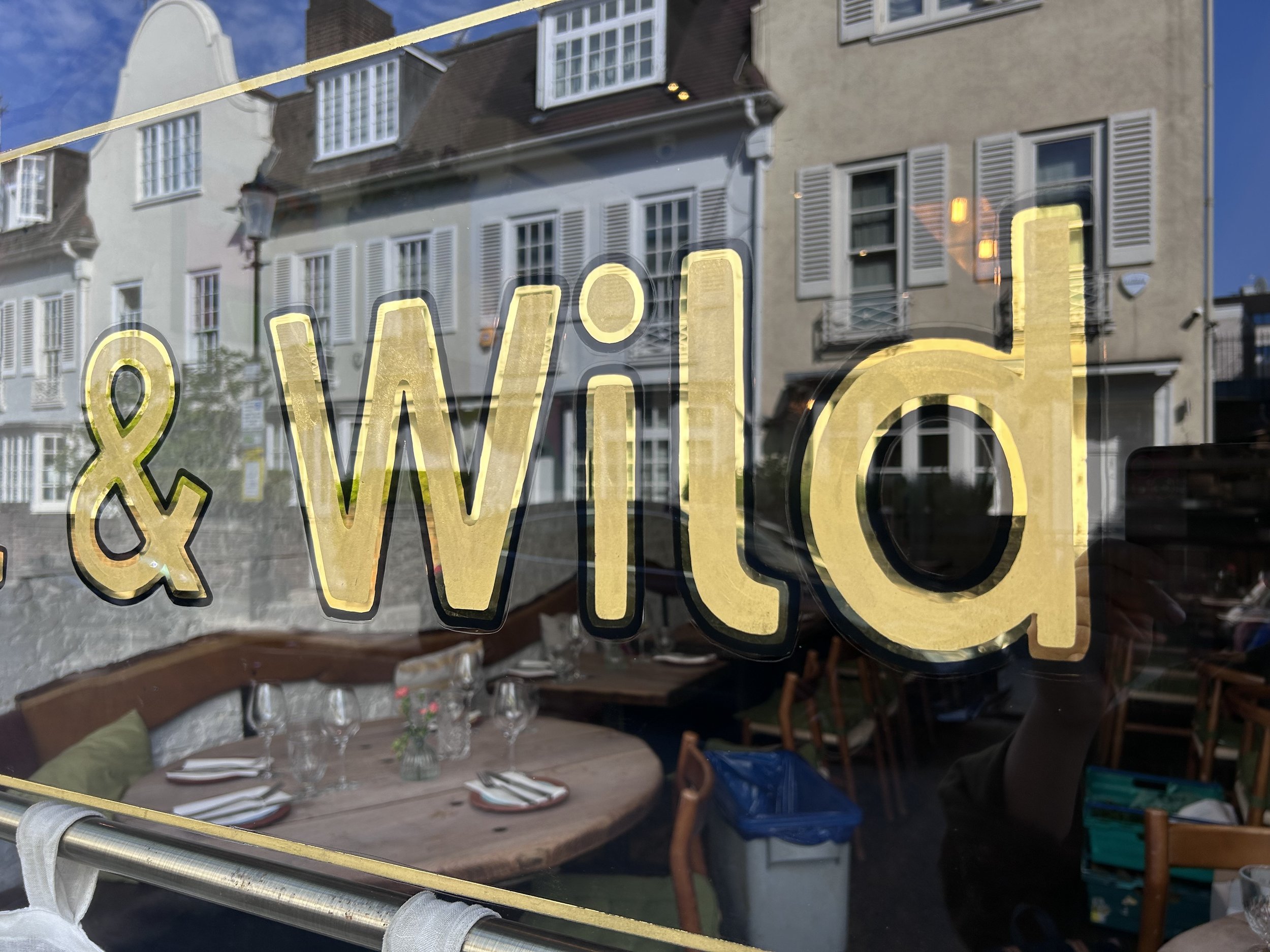 Two Fascias Painted and Gilded for this independant restaurant in Chelsea. Including a ‘badge-style’ swing signs designed and fabricated and also a section of Tiling designed and hand painted to attach to the shopfront. Two-tone Gold leaf windows with company logo. On this project we worked at trying to devolop an English style of bistro design, echoing the European tradition.