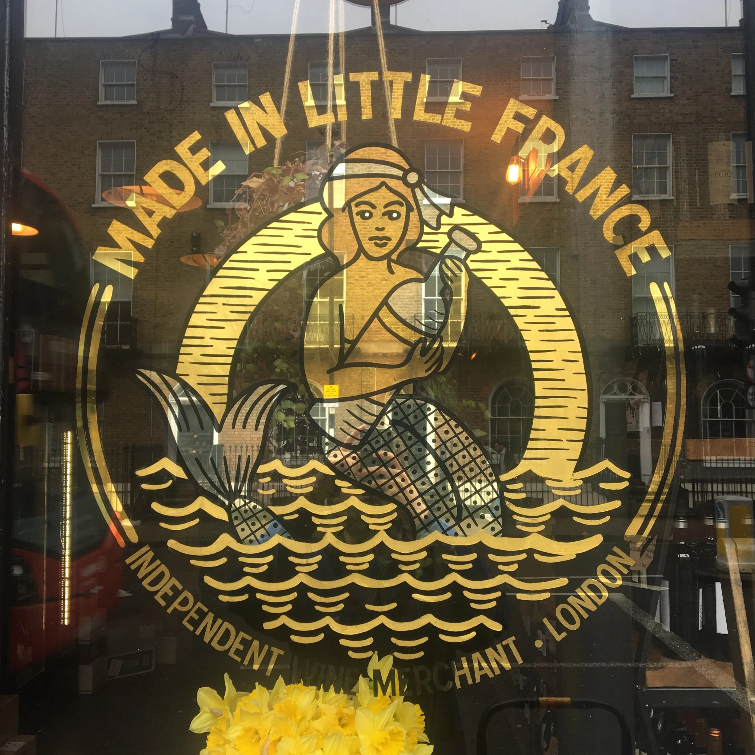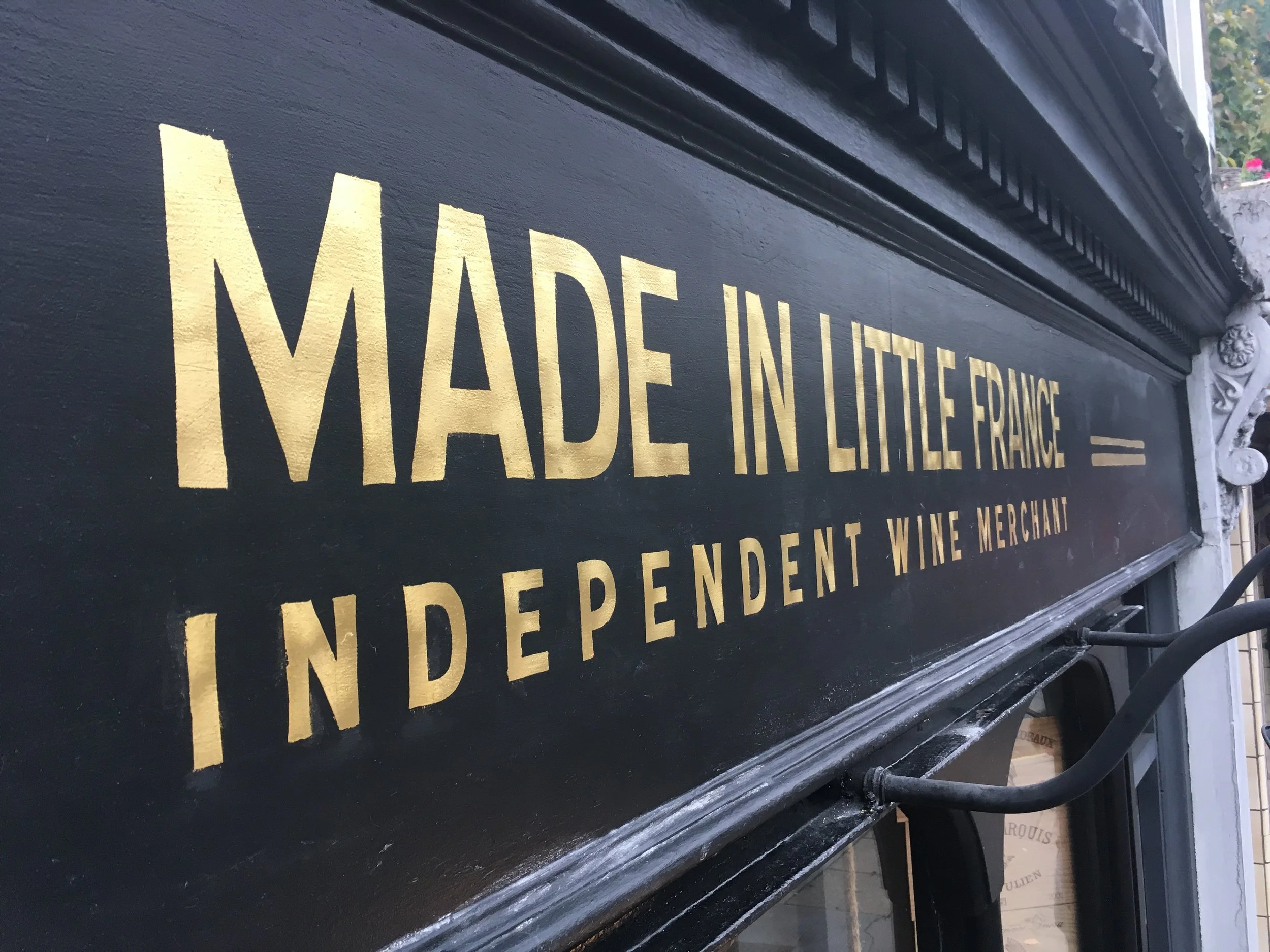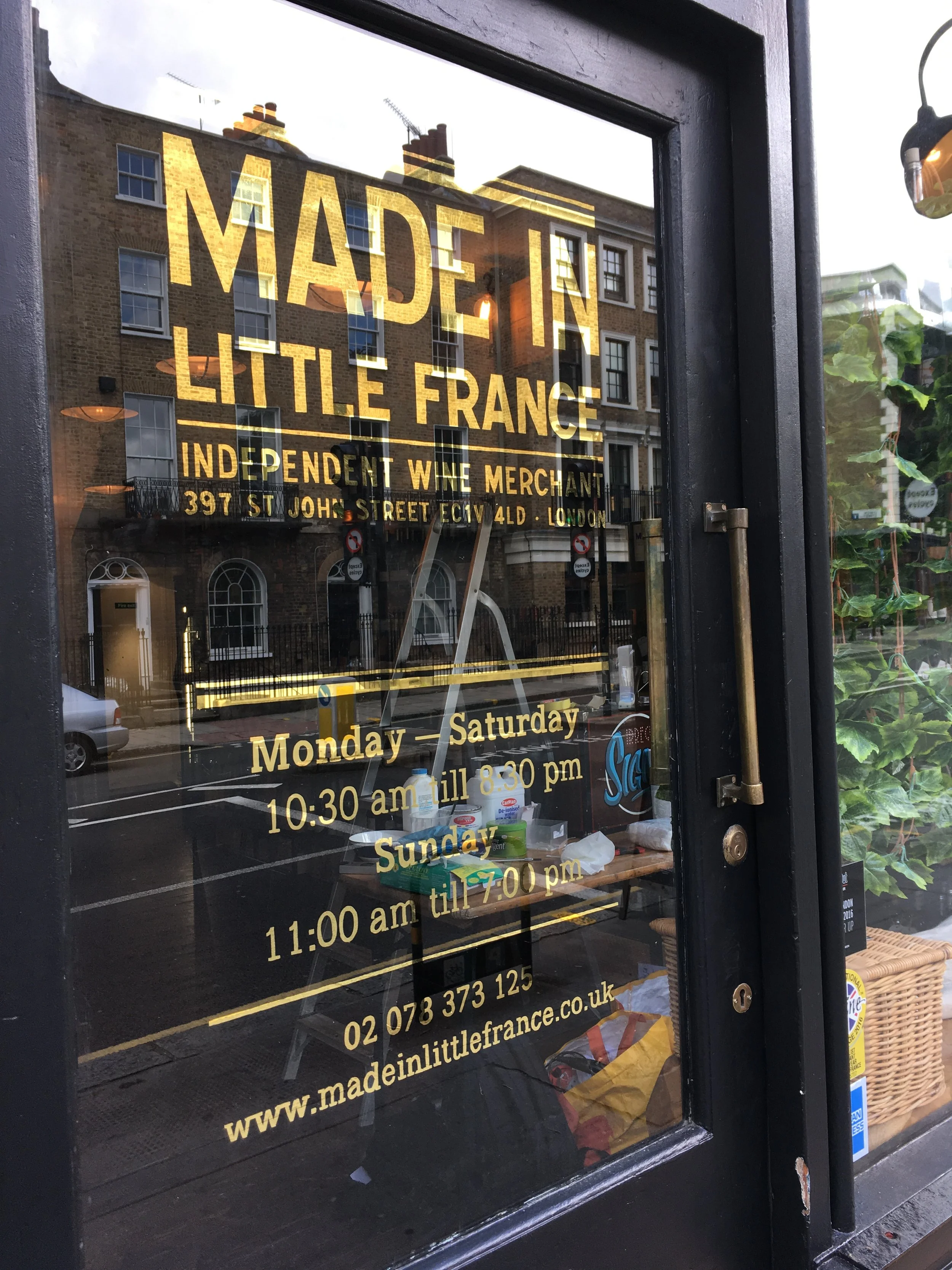 Fully Gilded shopfront complete with Fascia, opening times and contact information on the door and Gilded Logo for this North London Wine Shop. The combination of mirror and matt finishes and different colours of gold leaf makes this logo really come to life.