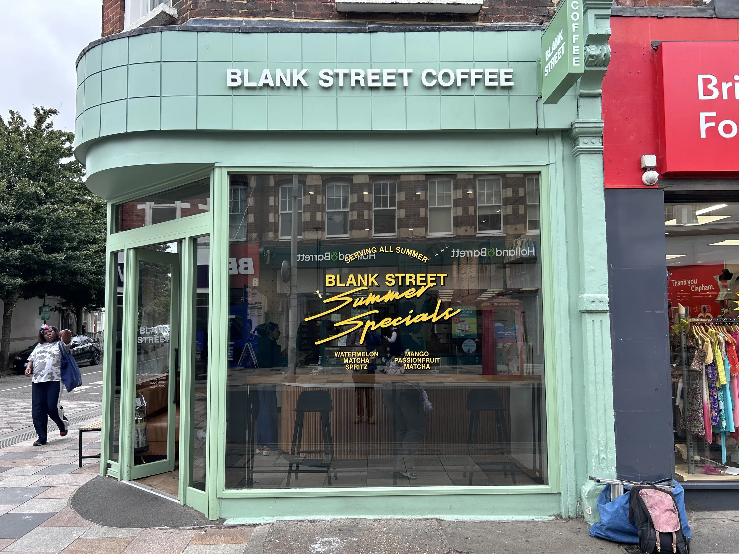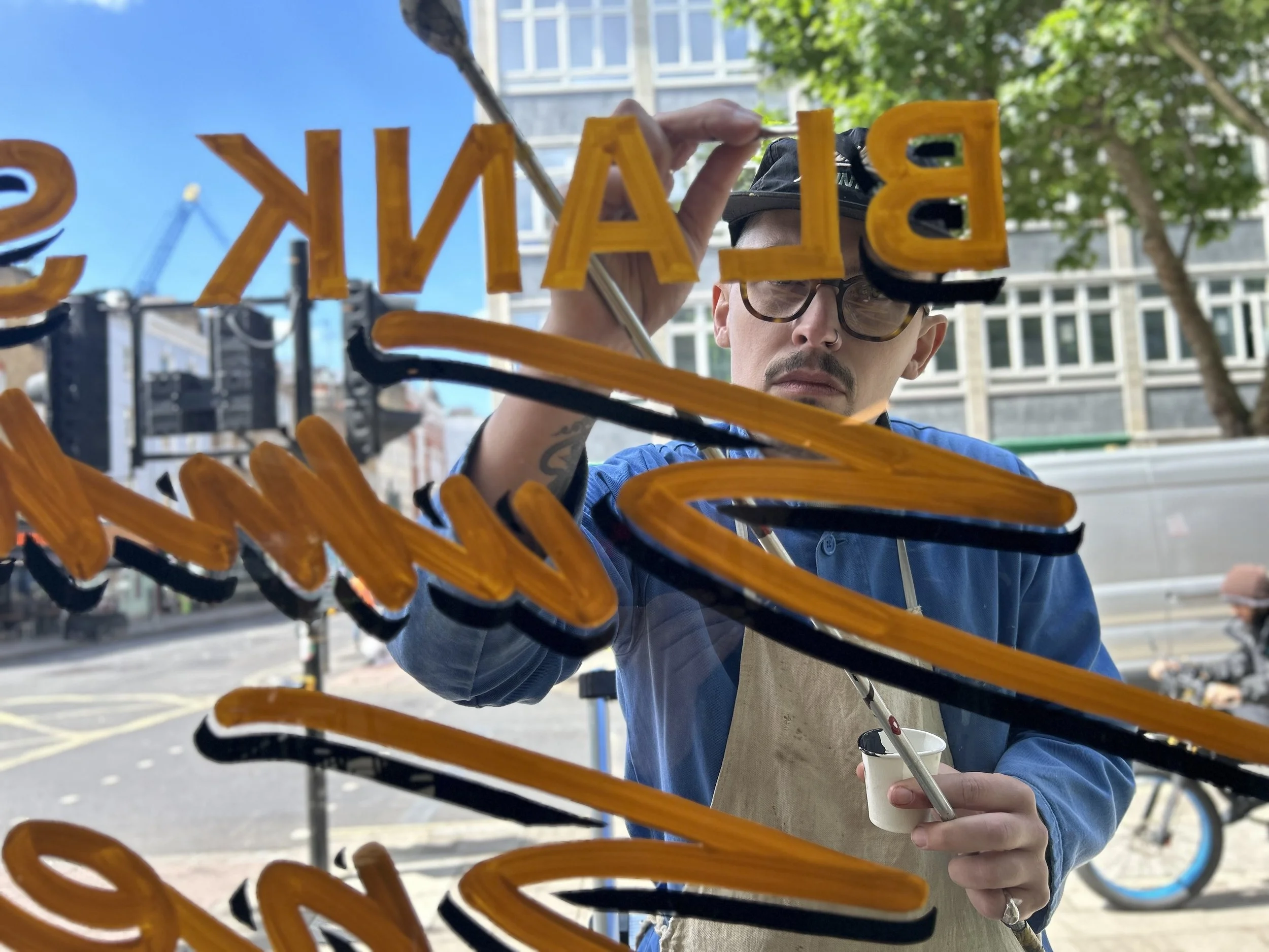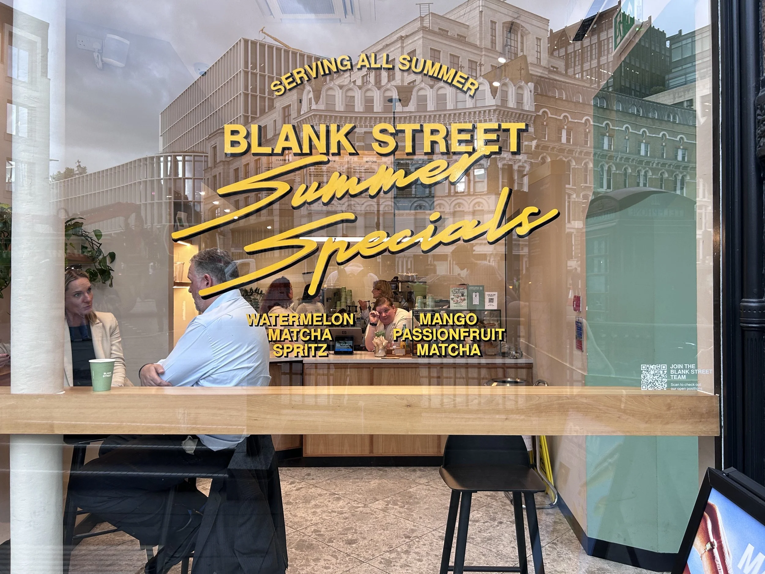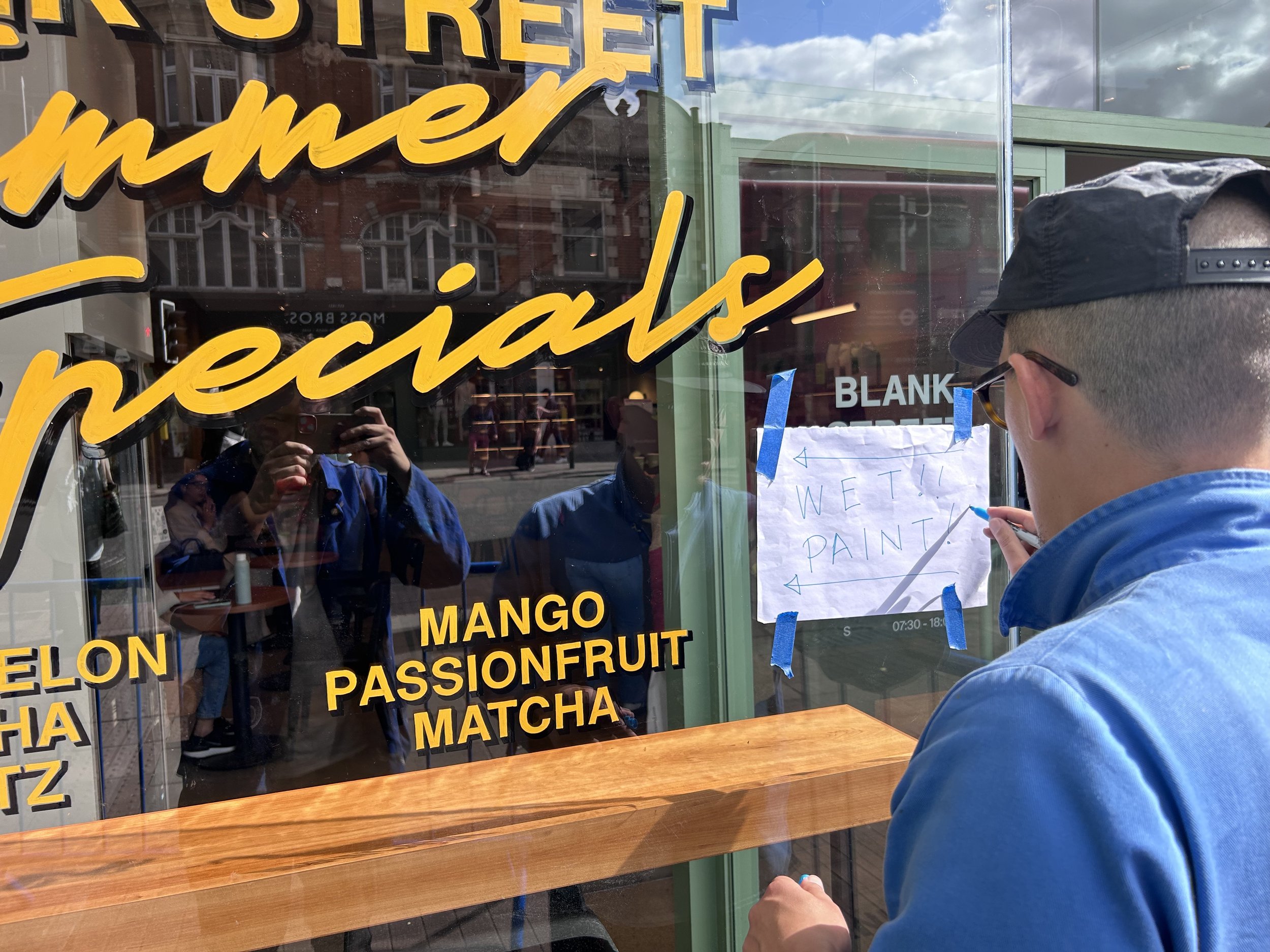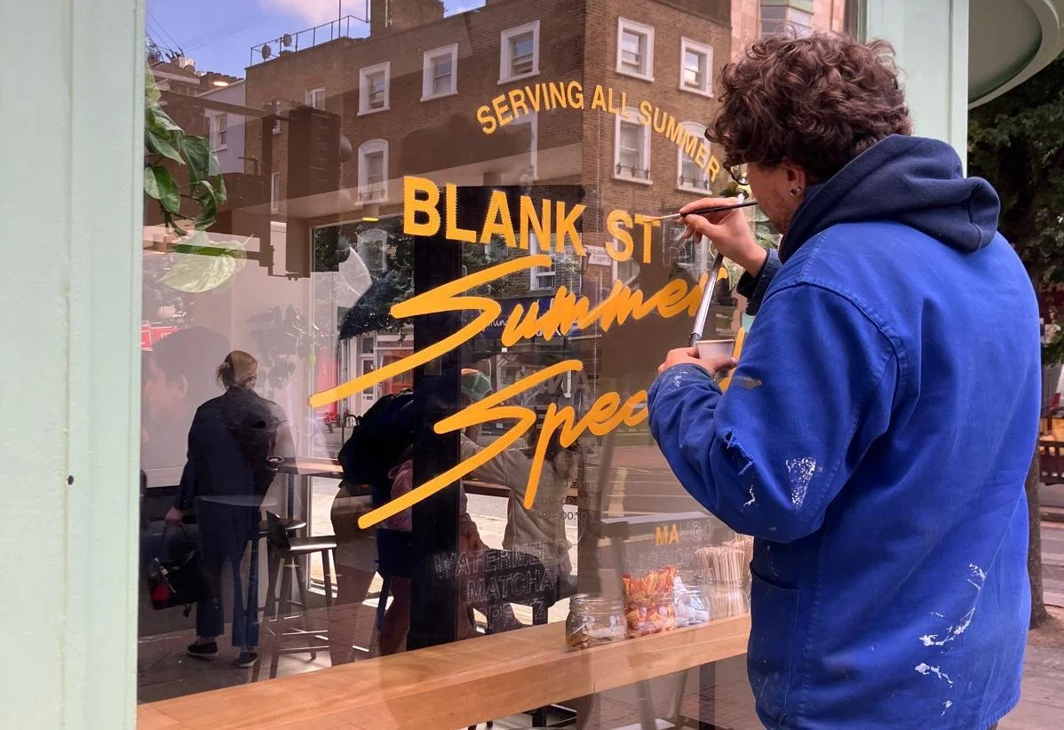 For this chain of Coffee shops, I visited 7 venues to paint a window splash promoting their new drinks. We used a classic ‘gold’ colour with black shadows to give a more traditional look to this modern design.