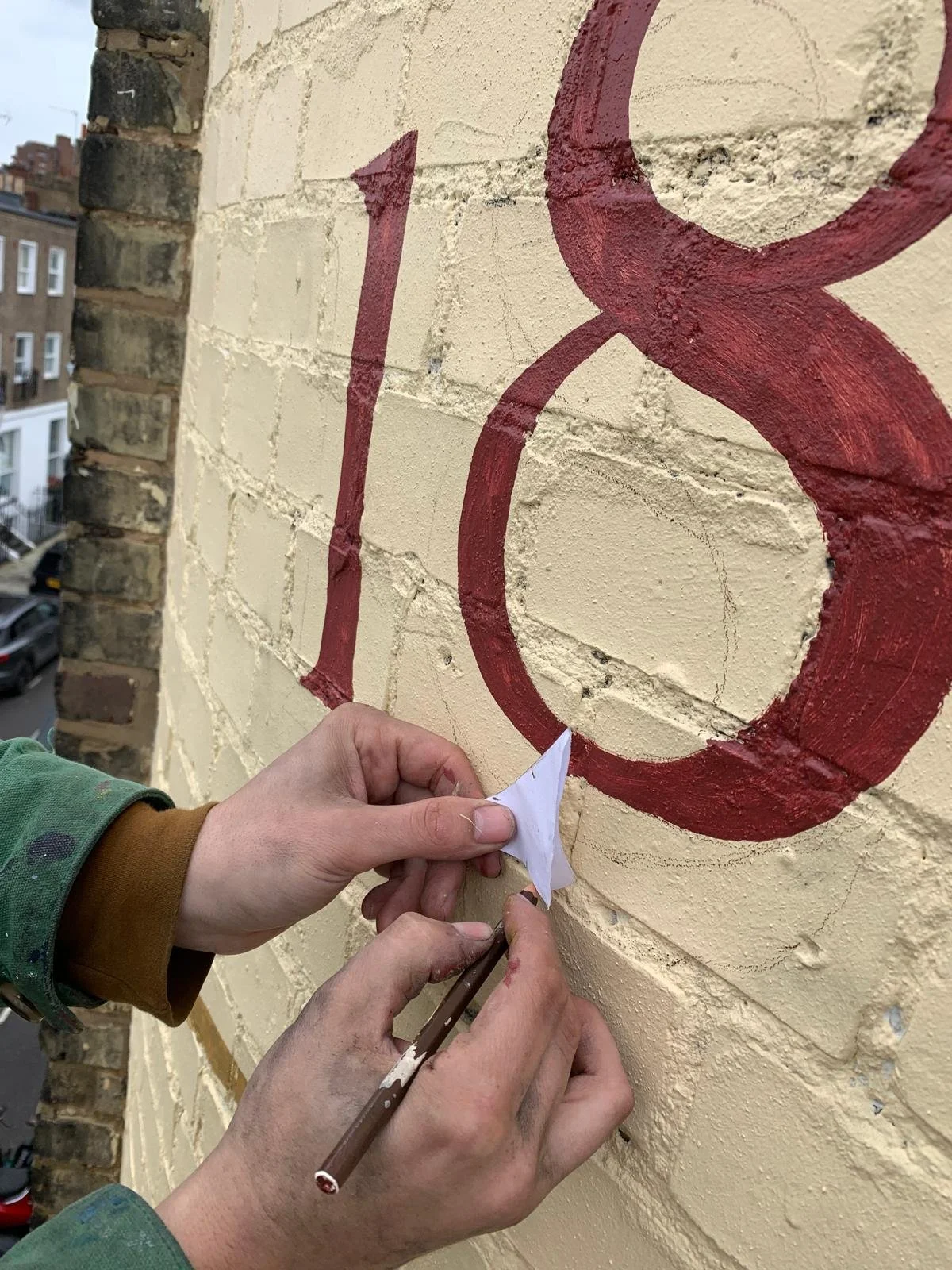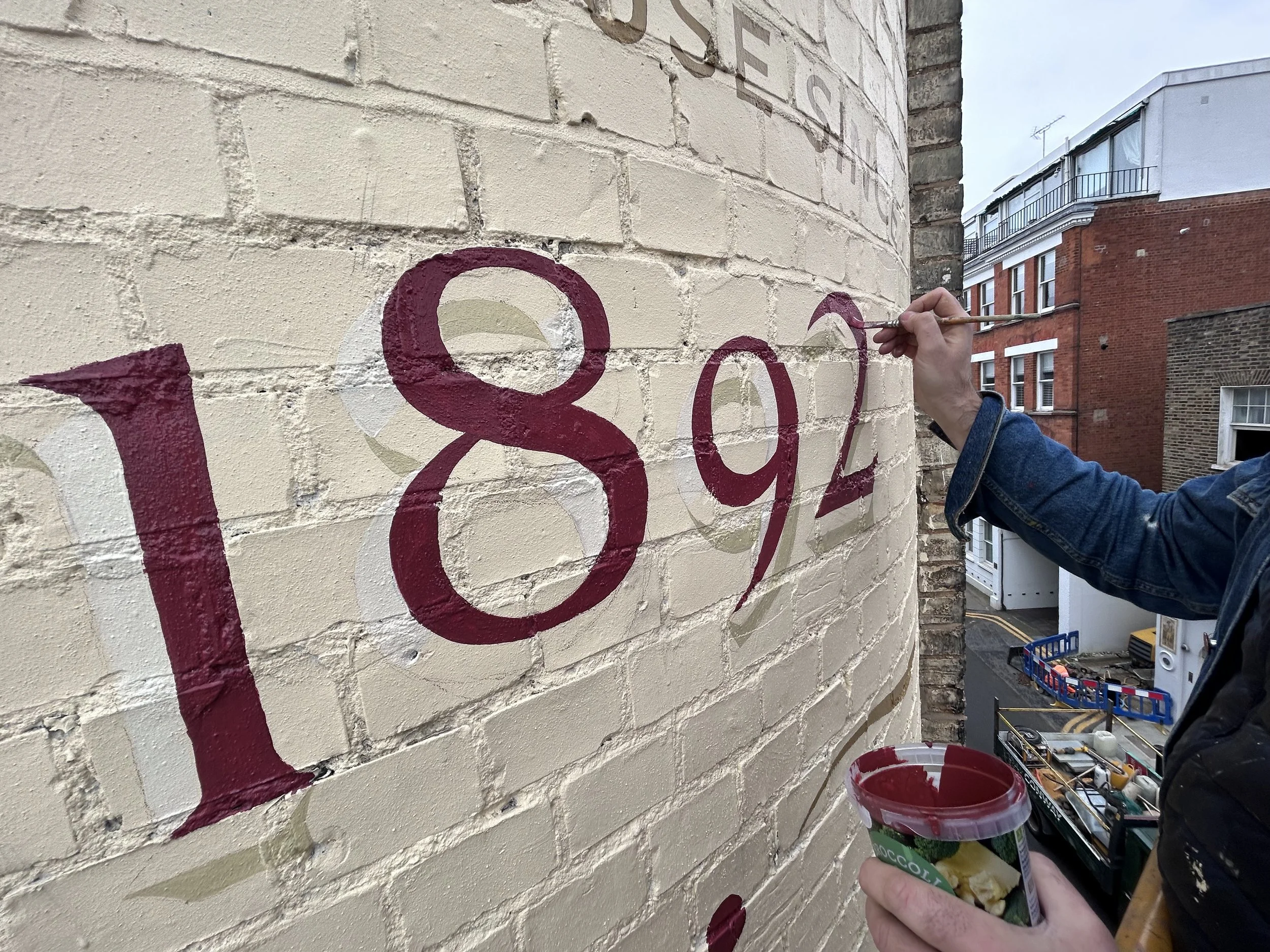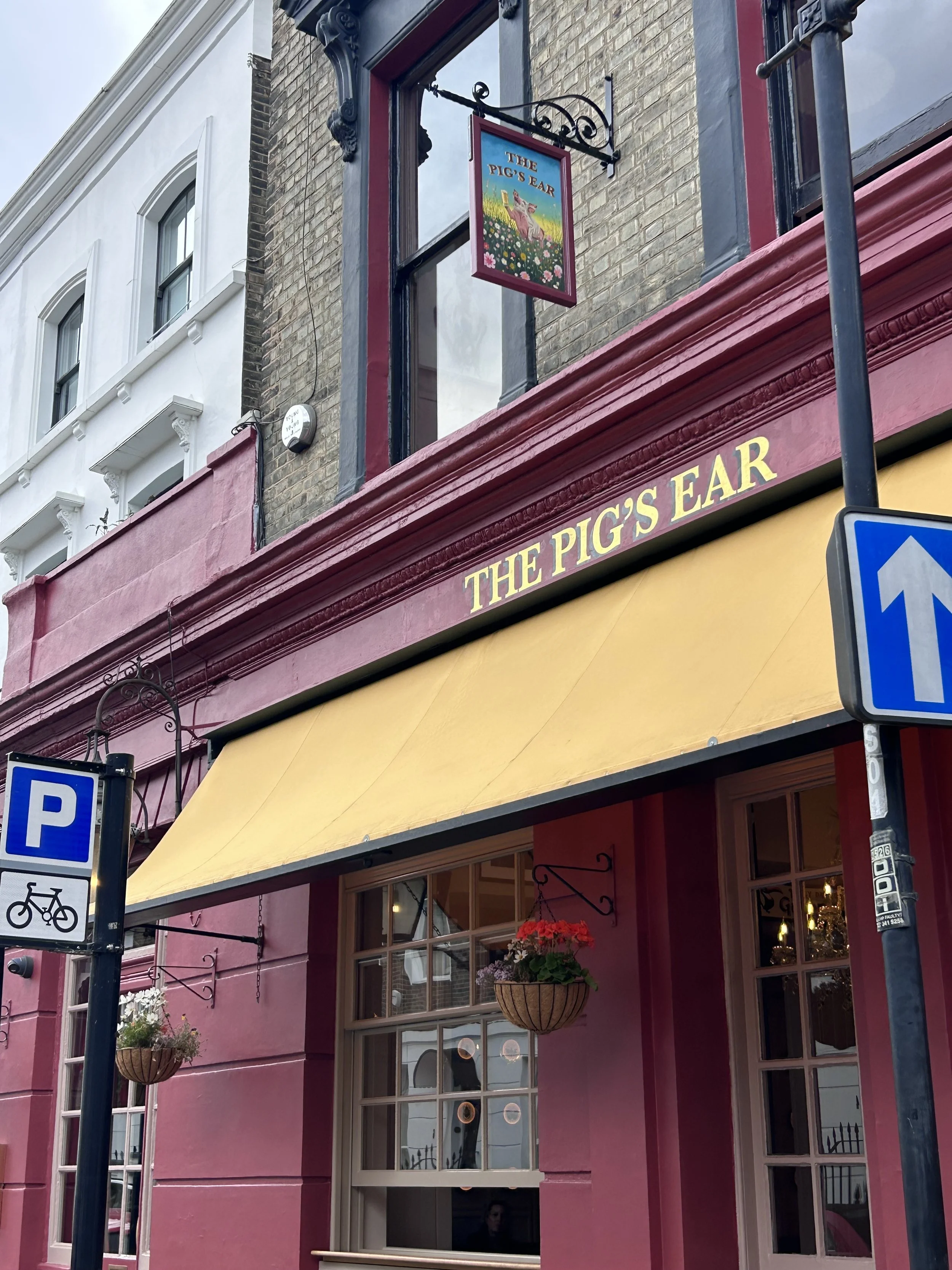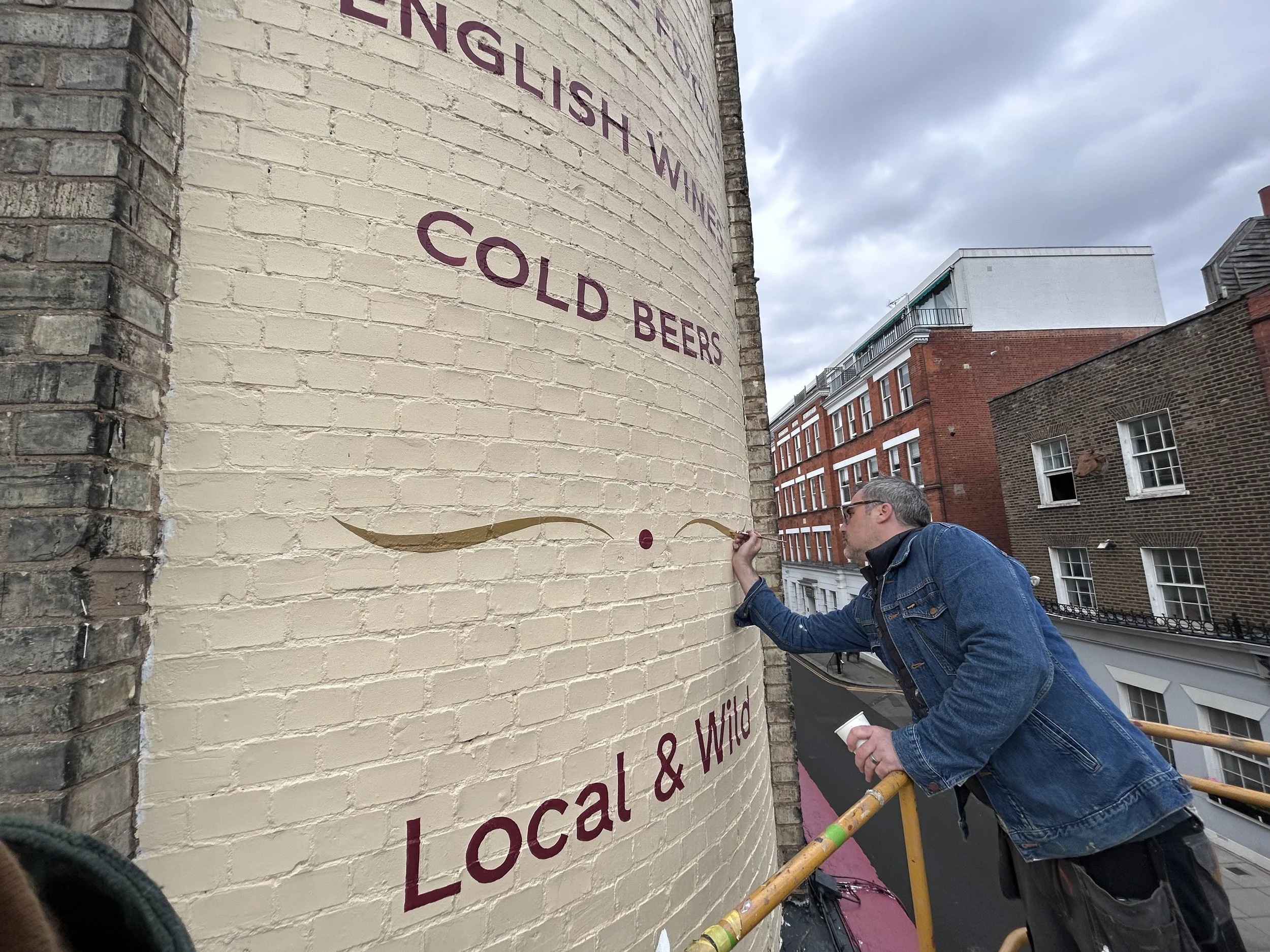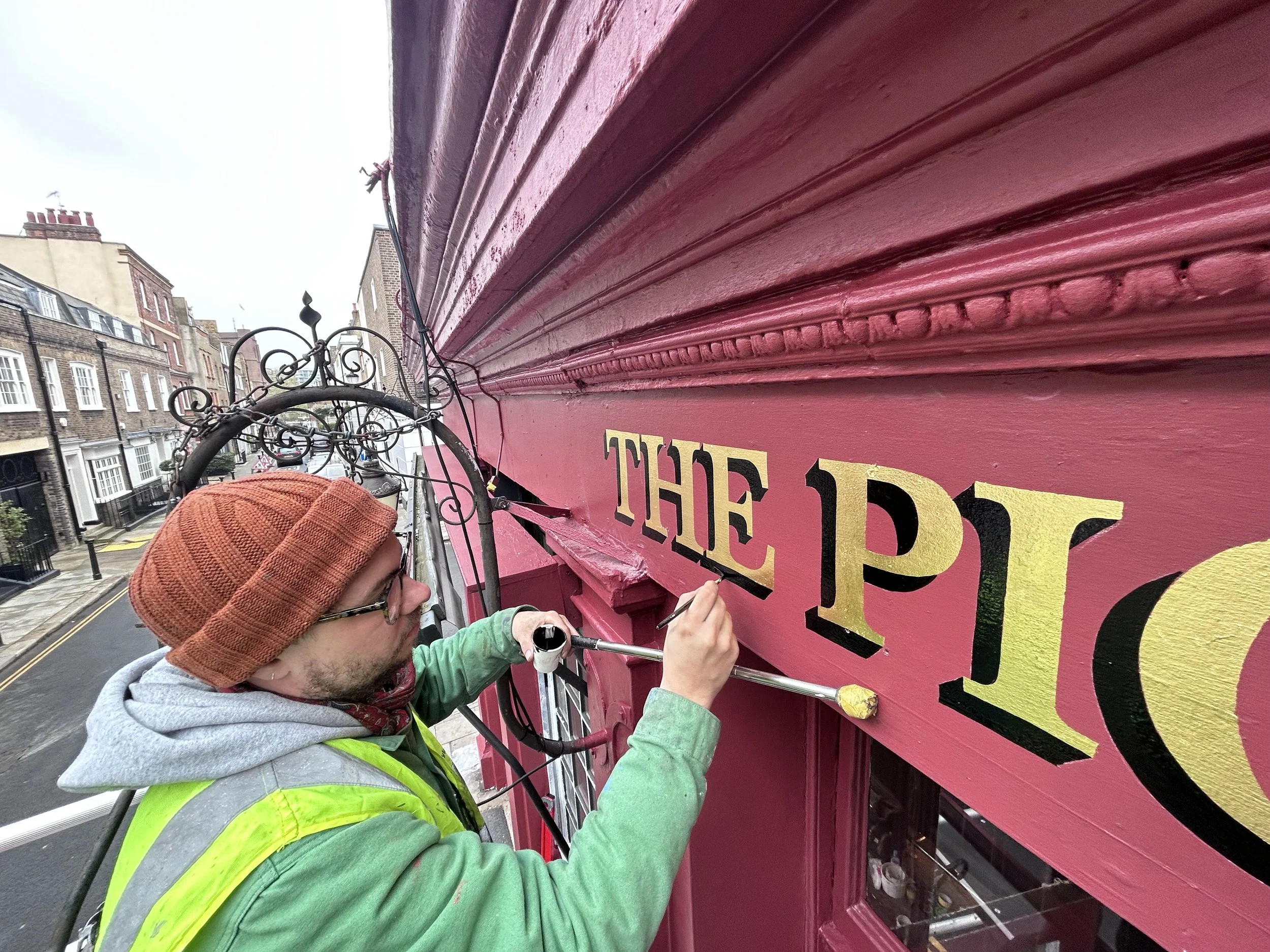 Gilded Fasica and Corner Sign on Brick for this Chelsea Pub. Swing Sign painted with Clients Design.