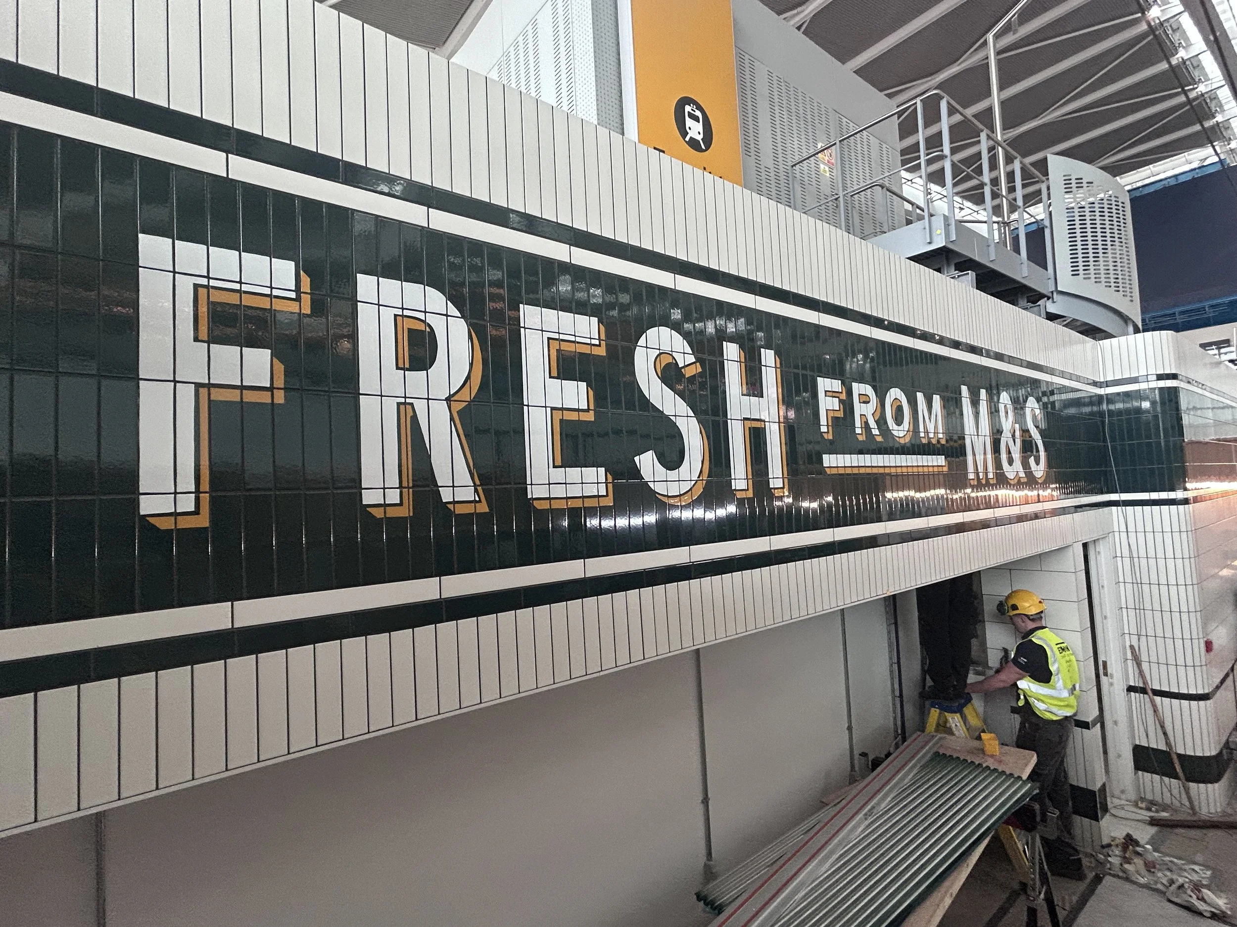 Hand Painted Lettering onto Tiles at this Airport M&S site. In this project we painted around the grouting lines in order to make it seem more like the lettering was part of the tiling.