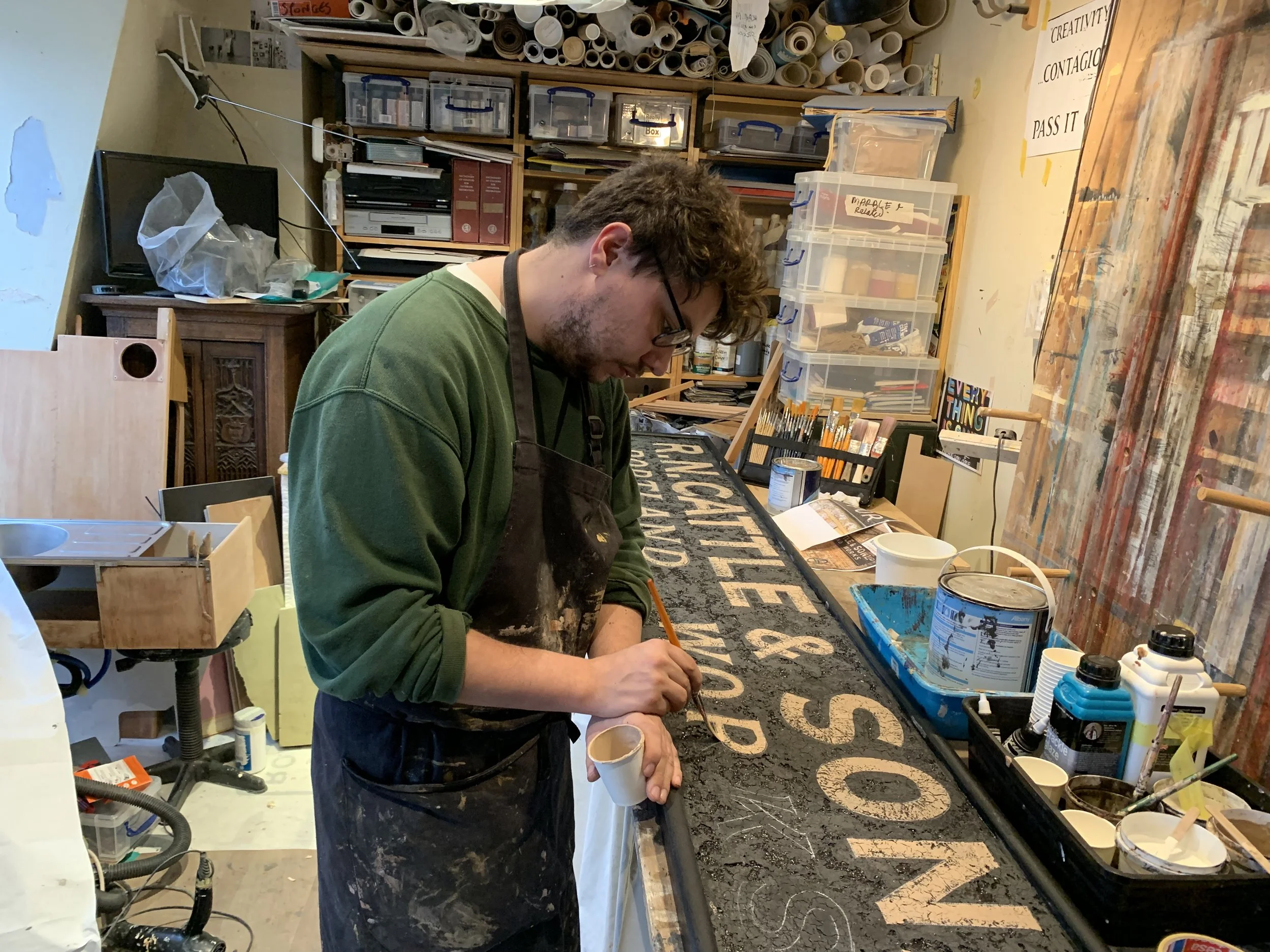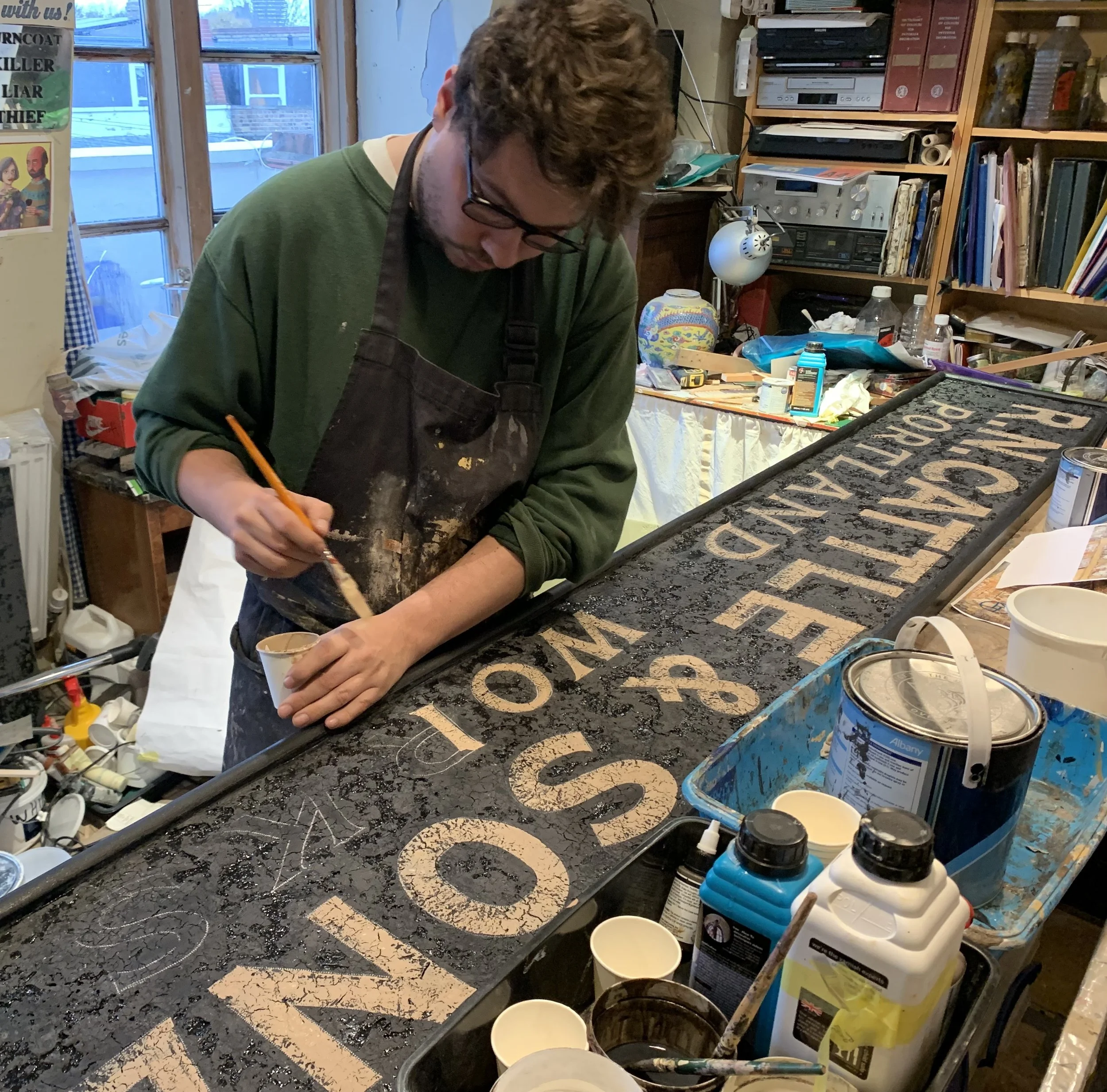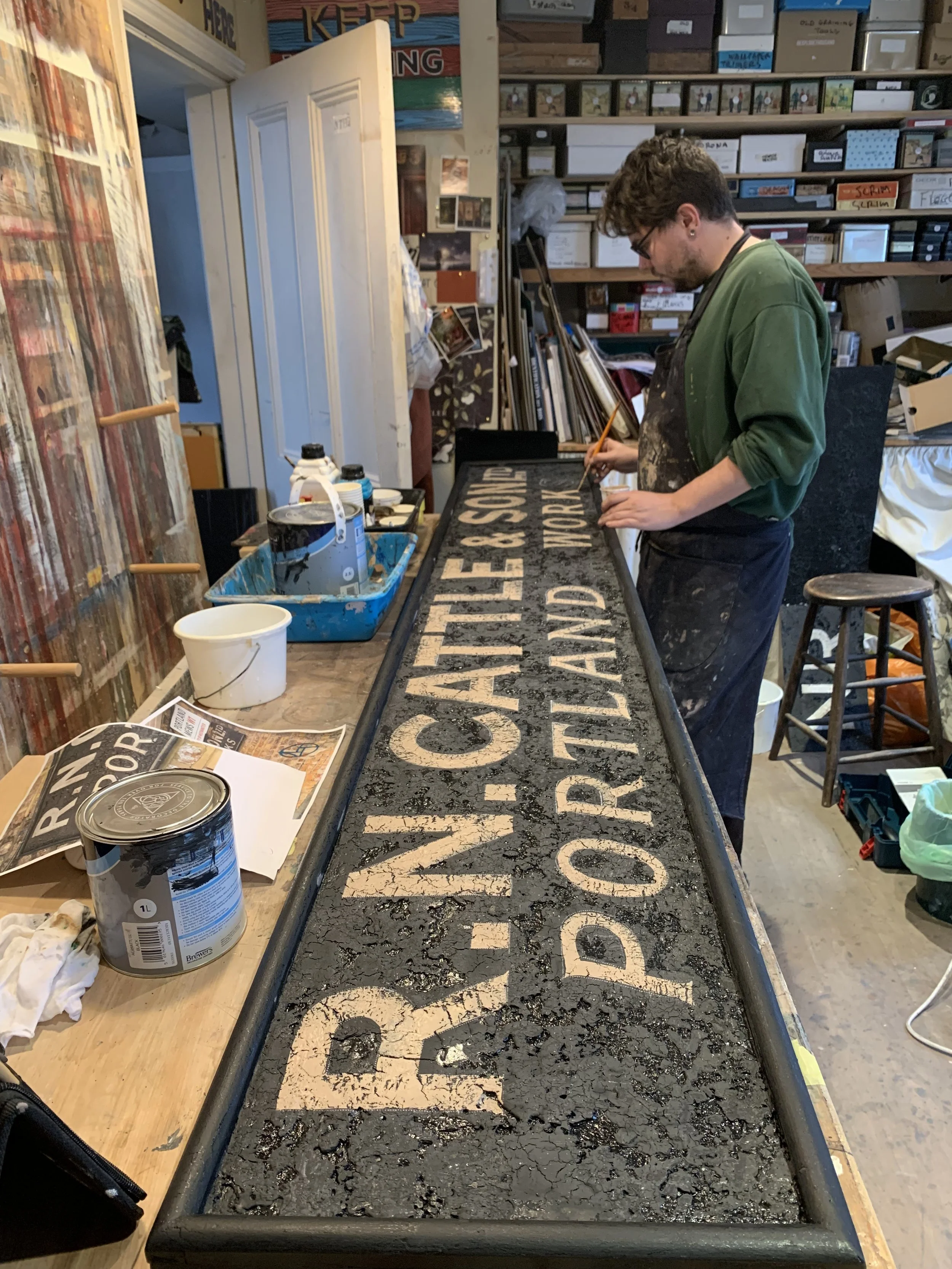 This Sign was made as a Replica of a Historic Sign in Soho, The Descendants of the original business owner commissioned me to create a replica for his retirement, so that he could display it at home and keep the beautiful piece of history in place. I tried to keep as much of the aged patina as possible, but we decided to slightly minimise the damage to the frame in order to make it more aesthetically pleasing for its home setting.